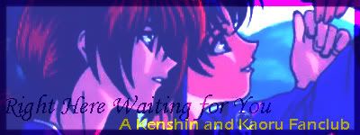 Welcome to Right Here Waiting For You, named after the song by Richard Marx, a club for KenshinxKaoru lovers. Kenshin and Kaoru share a romance that goes almost beyond words to describe. It's a realtionship of understanding, of deep love, sacrifice and waiting. Kaoru is often waiting for Kenshin, whether its for him to come rescue her, to come back home from a journey, or simply waiting for him to tell her his feelings. She shows great patience and faith in him, knowing that no matter where Kenshin goes, spiritually or physically, he will come back to her. So if you love this couple as much as I do, please join!